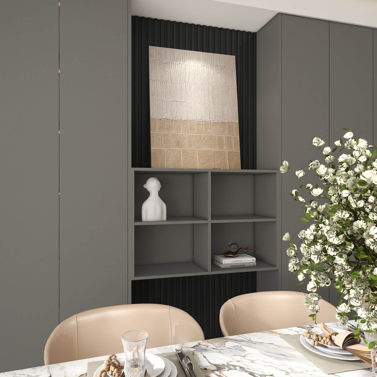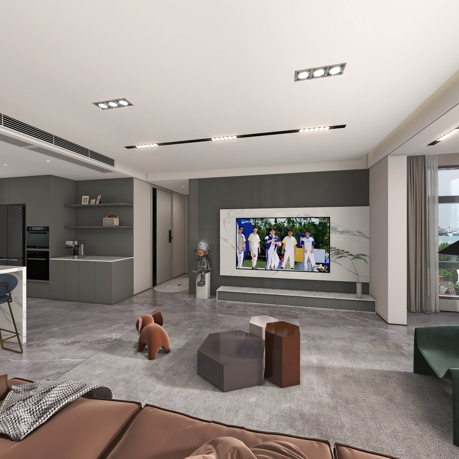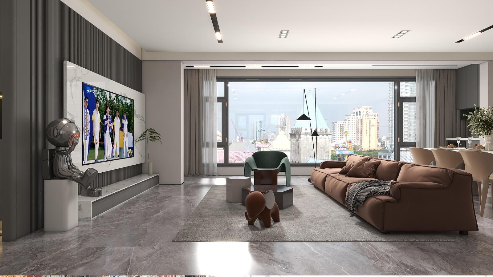 光影流動,木飾面、大理石、木格柵交織出不同層次秩序,給予空間精致質感。