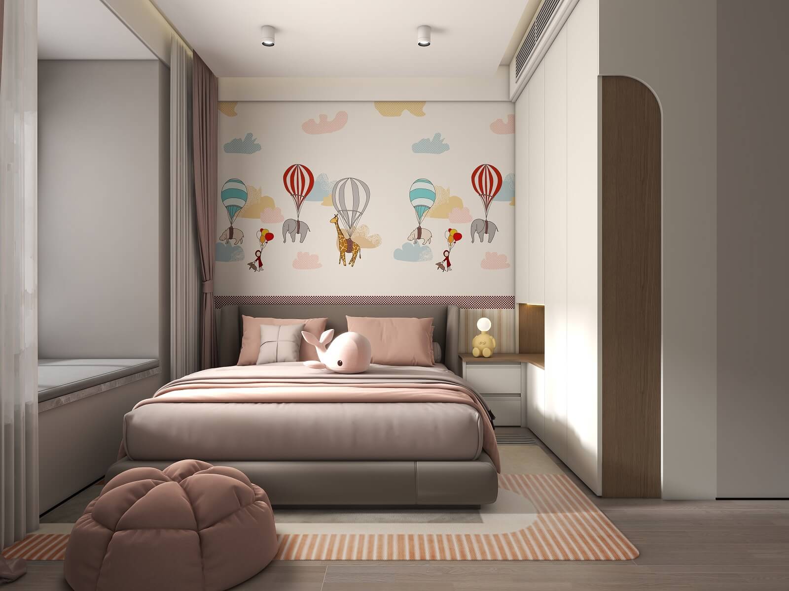 兒童房采用溫柔的奶白作為空間底色,整墻卡通貼畫搭配奶油白衣柜,在細節上用粉色裝飾作為跳色,無形中增加立體感和層次感,營造出童真舒適的兒童夢中情房。
